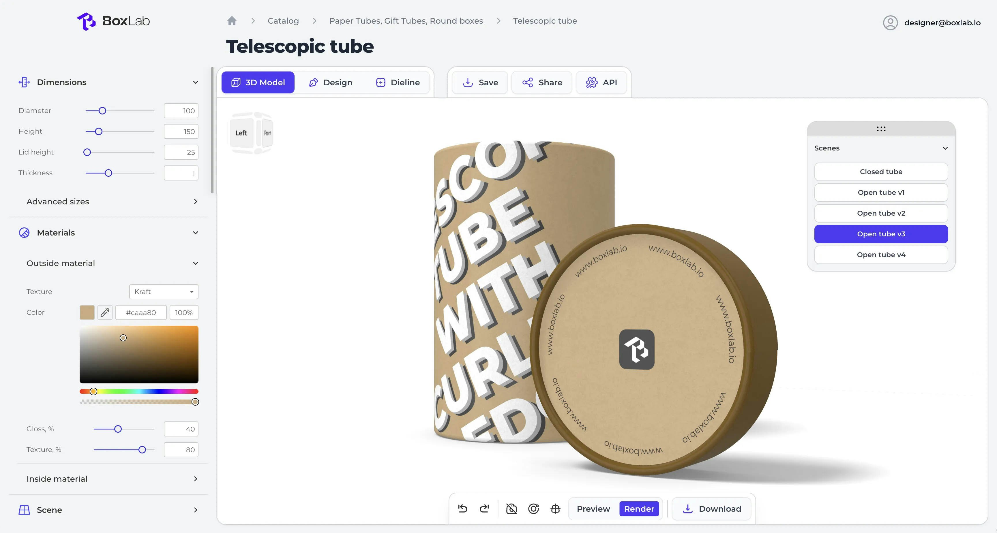- Интерактивный 3D-редактор: возможность мгновенно настраивать размеры, материалы и освещение ваших упаковок.