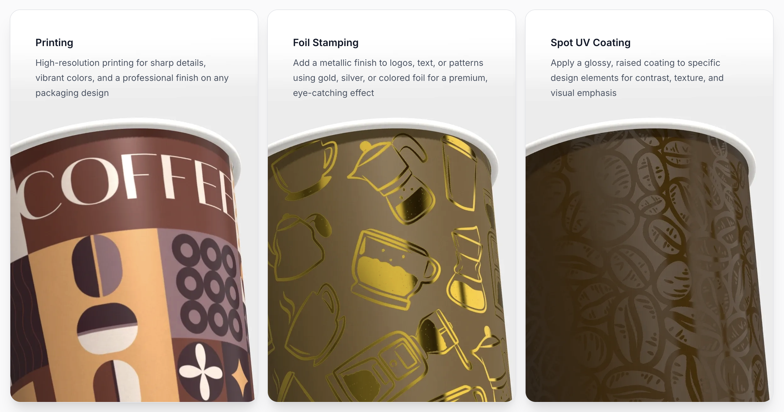 - Профессиональная отделка: возможности тиснение (золото, серебро, цвет) и UV-лак для создания более привлекательных и качественных упаковок.