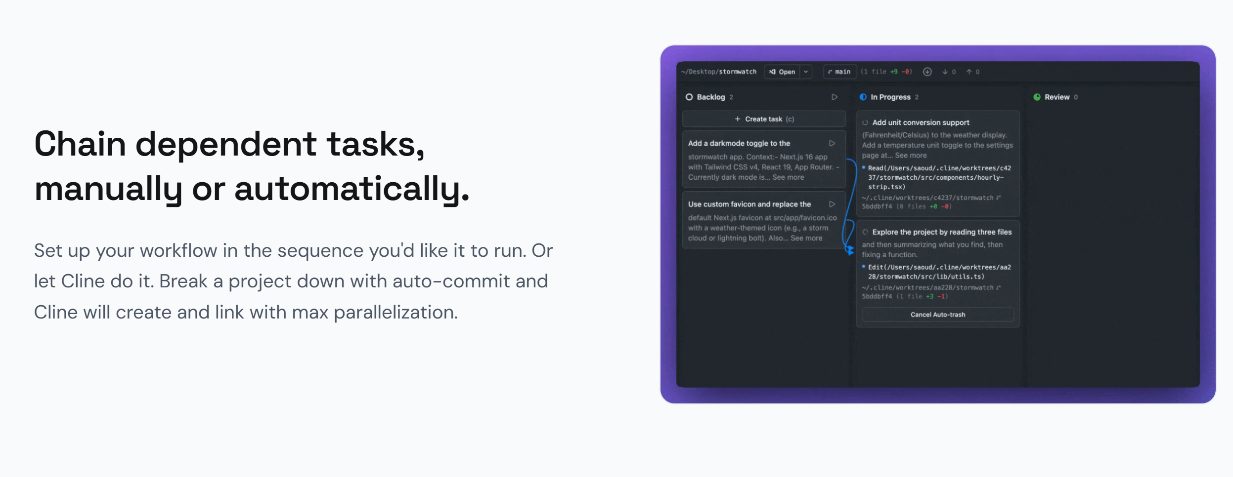 С помощью Cline Kanban вы можете разбивать большие проекты на более мелкие задачи, упрощая управление и контроль за выполнением задач. Платформа интегрируется со средствами отслеживания задач, позволяя получать информацию о состоянии работы в реальном времени, что делает её незаменимым инструментом для современных команд разработчиков.