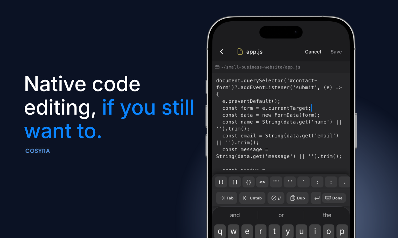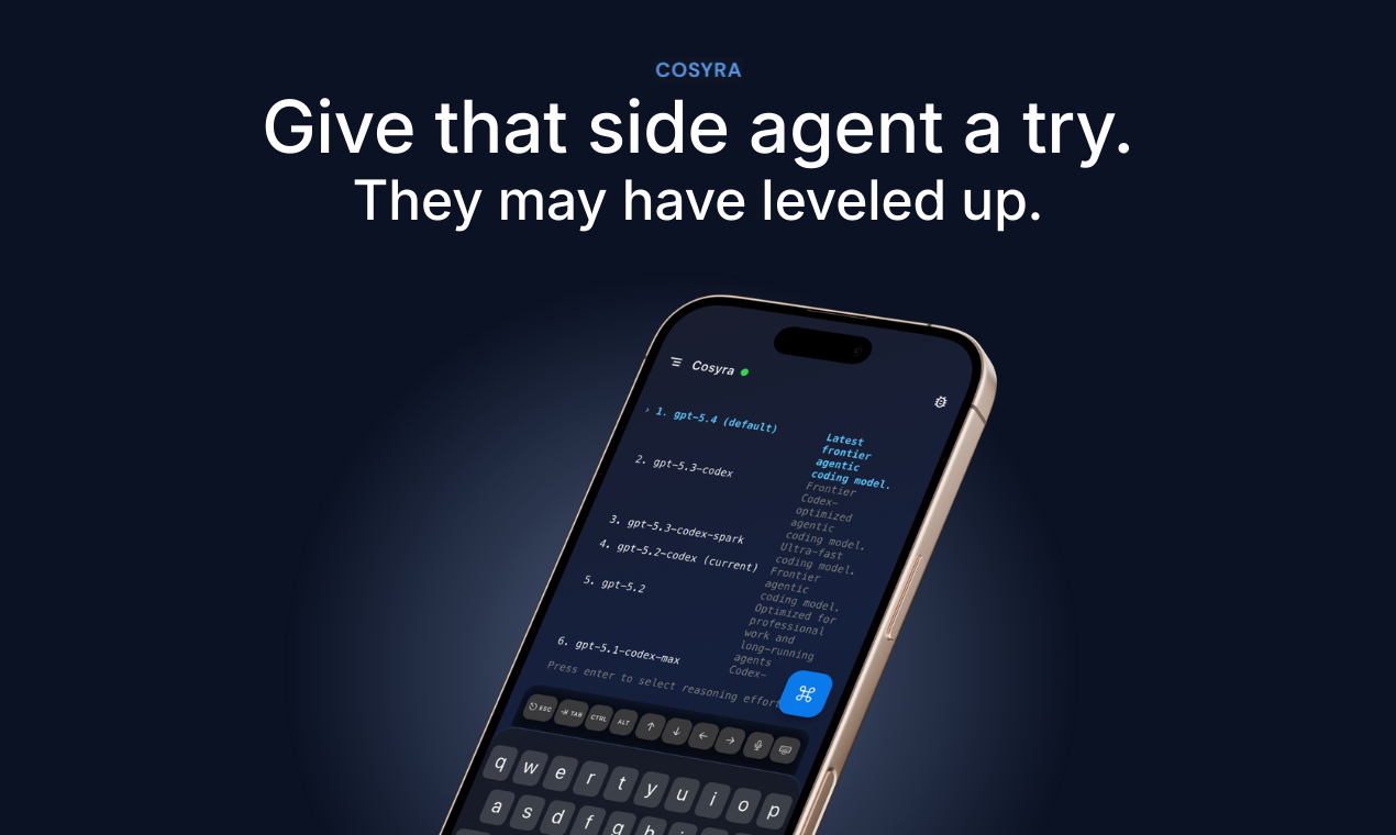 Cosyra — это мобильный терминал, позволяющий разработчикам запускать код прямо со смартфона. Он предлагает полноценную рабочую среду в облаке, обеспечивая доступ к таким инструментам, как Claude Code, Codex CLI, OpenCode и Gemini CLI. Cosyra представляет собой идеальное решение для тех, кто хочет писать и тестировать код на ходу без необходимости иметь при себе ноутбук или стационарный сервер.
