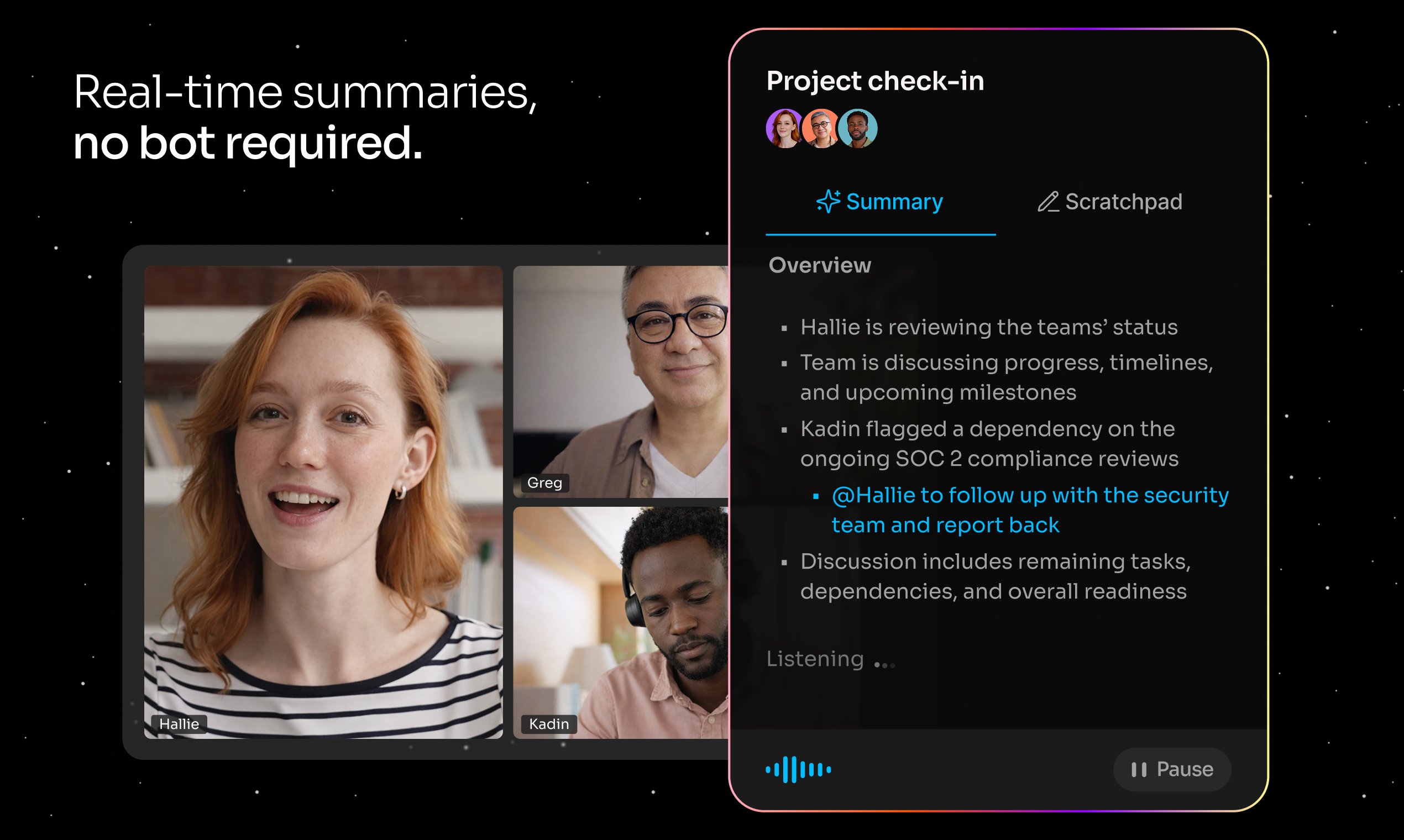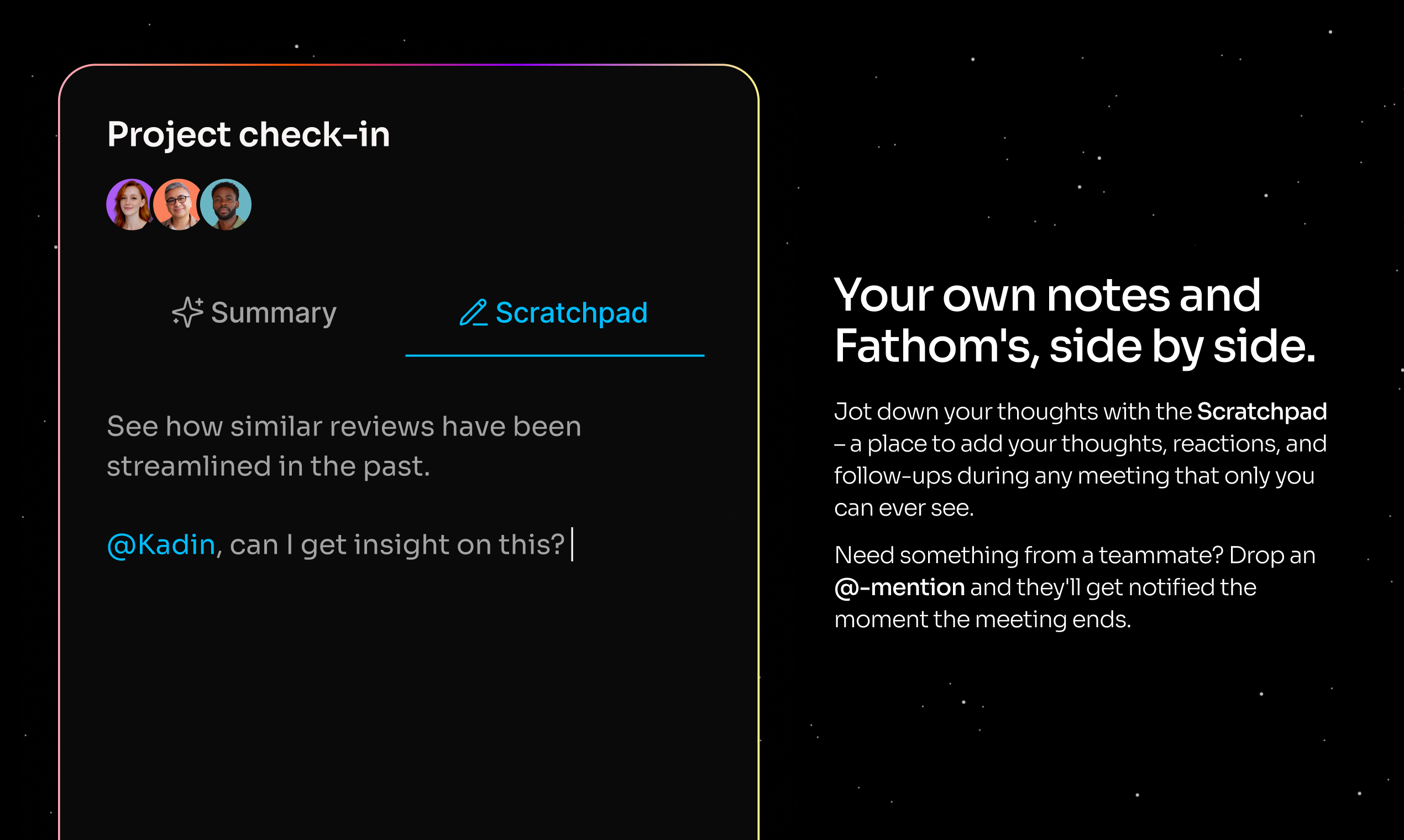 Fathom решает проблему неэффективного ведения заметок, позволяя пользователю сосредоточиться на обсуждении, а не на том, чтобы фиксировать каждое слово. Интеллектуальная система быстро создает сводки и действия, которые отправляются на почту сразу после завершения звонка, освобождая пользователей от рутины.
