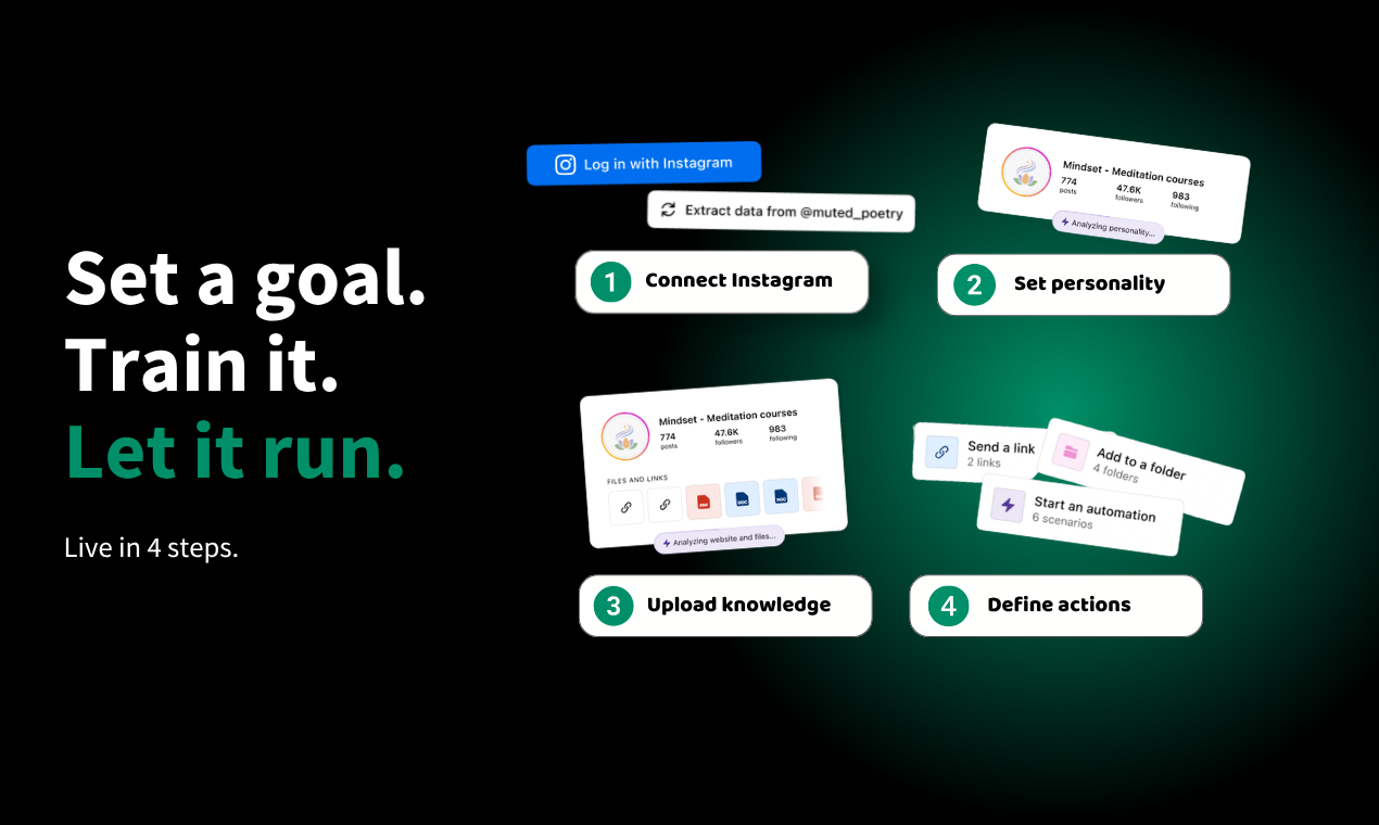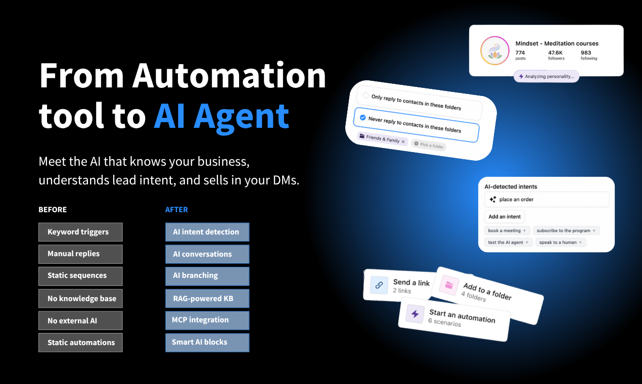 - AI-Agent: Автоматически отвечает на сообщения в директе, квалифицирует и следит за общением с вашими клиентами в вашем тоне.