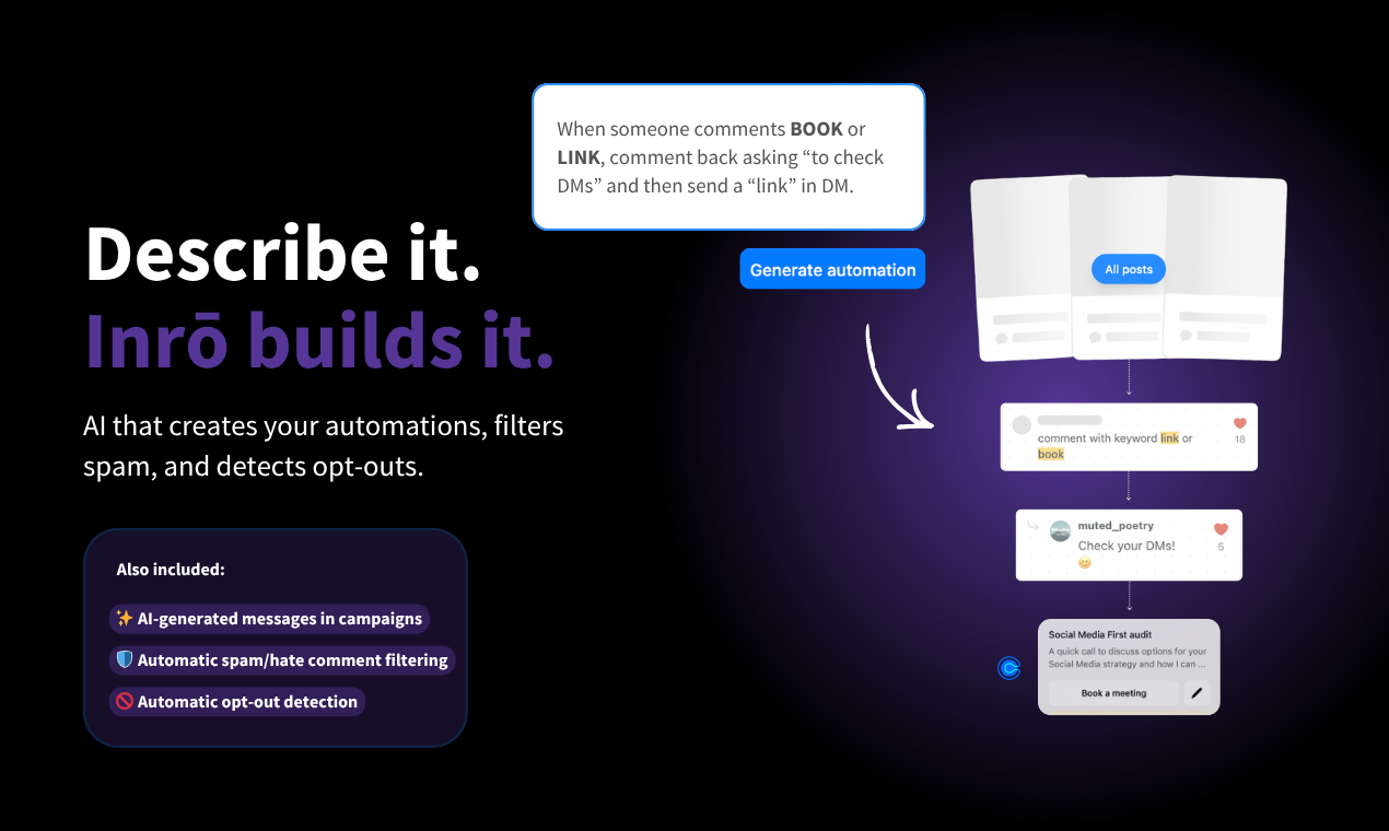 Inrō — это платформа автоматизации, специально разработанная для управления директ-сообщениями в Instagram. Она помогает пользователям более эффективно взаимодействовать с их аудиторией, автоматизируя процесс общения через DMs и комментарии. В век цифровых технологий, где взаимодействие с клиентами и последователями в социальных сетях становится всё важнее, такой инструмент позволяет бизнесам сосредоточиться на содержании, в то время как автоматизация берет на себя рутинные задачи.