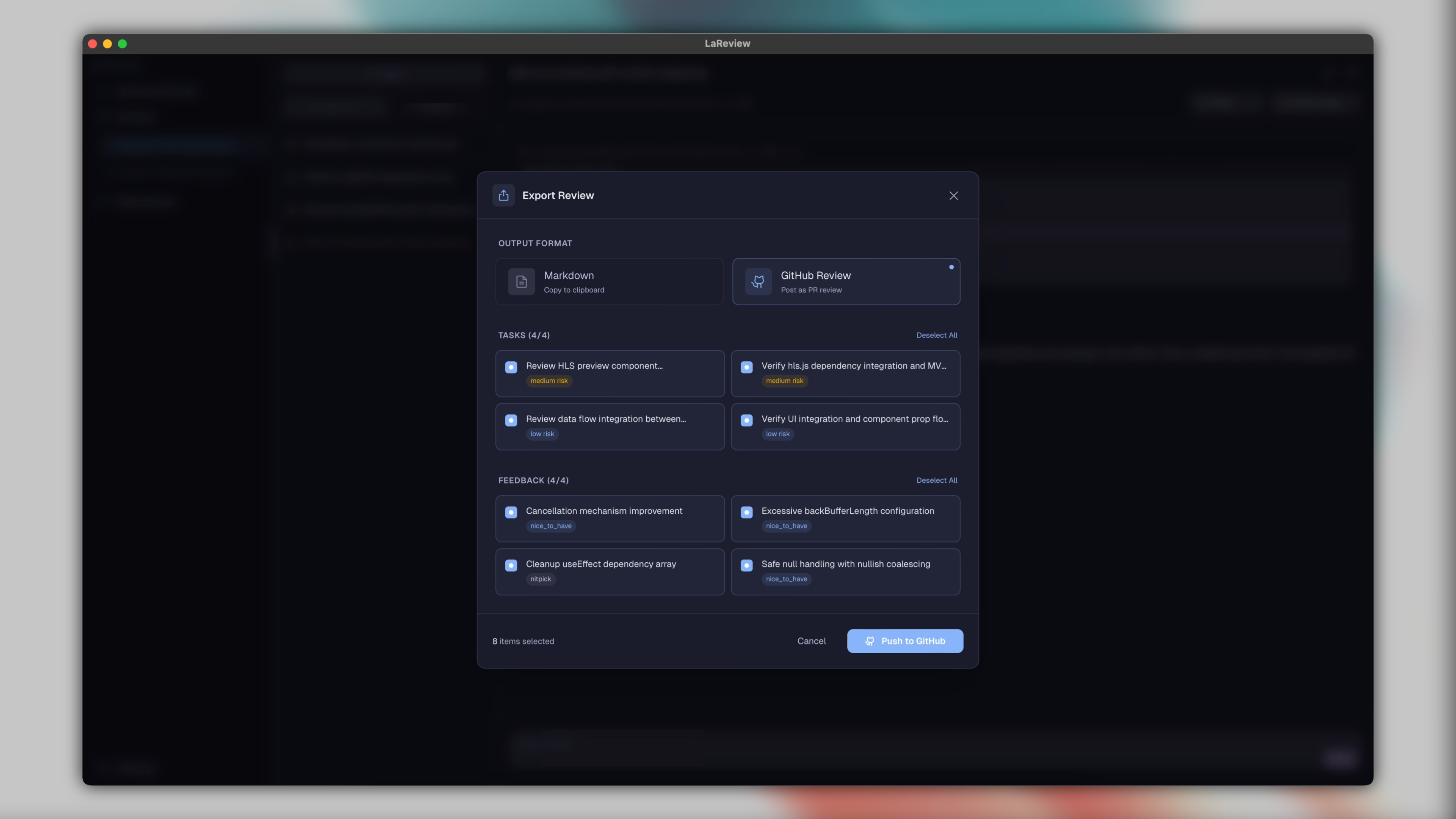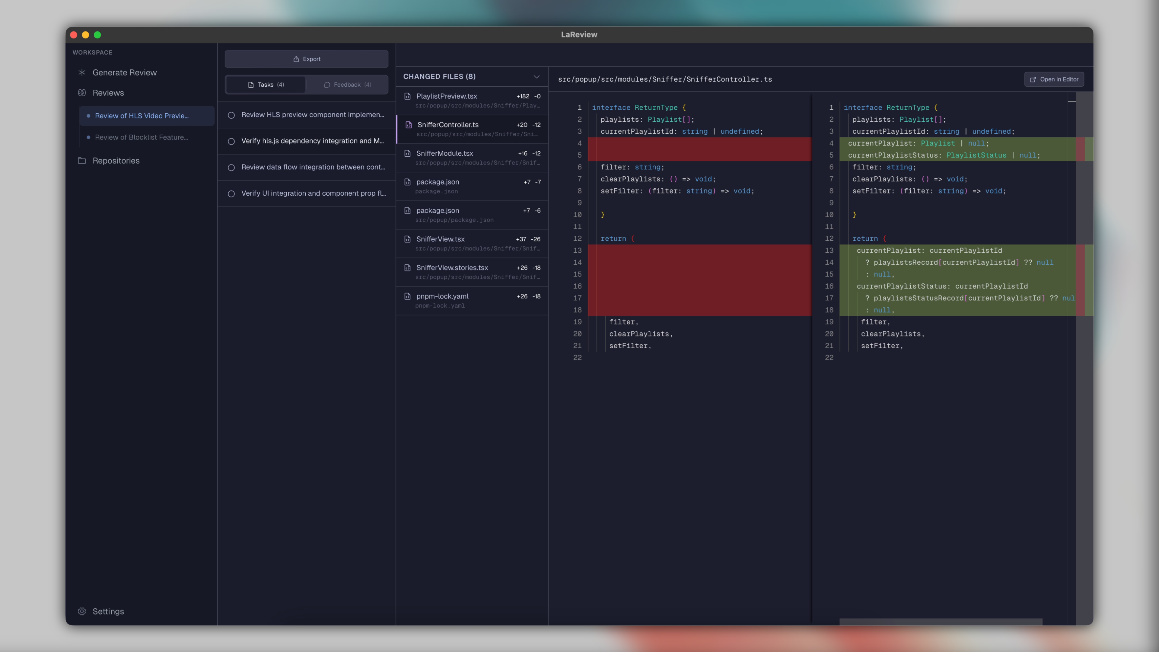 - AI-Powered Planning: Вводите PR (Pull Request) из GitHub или GitLab, и LaReview сам создаст структурированный план ревью, выявляя основные потоки и риски.