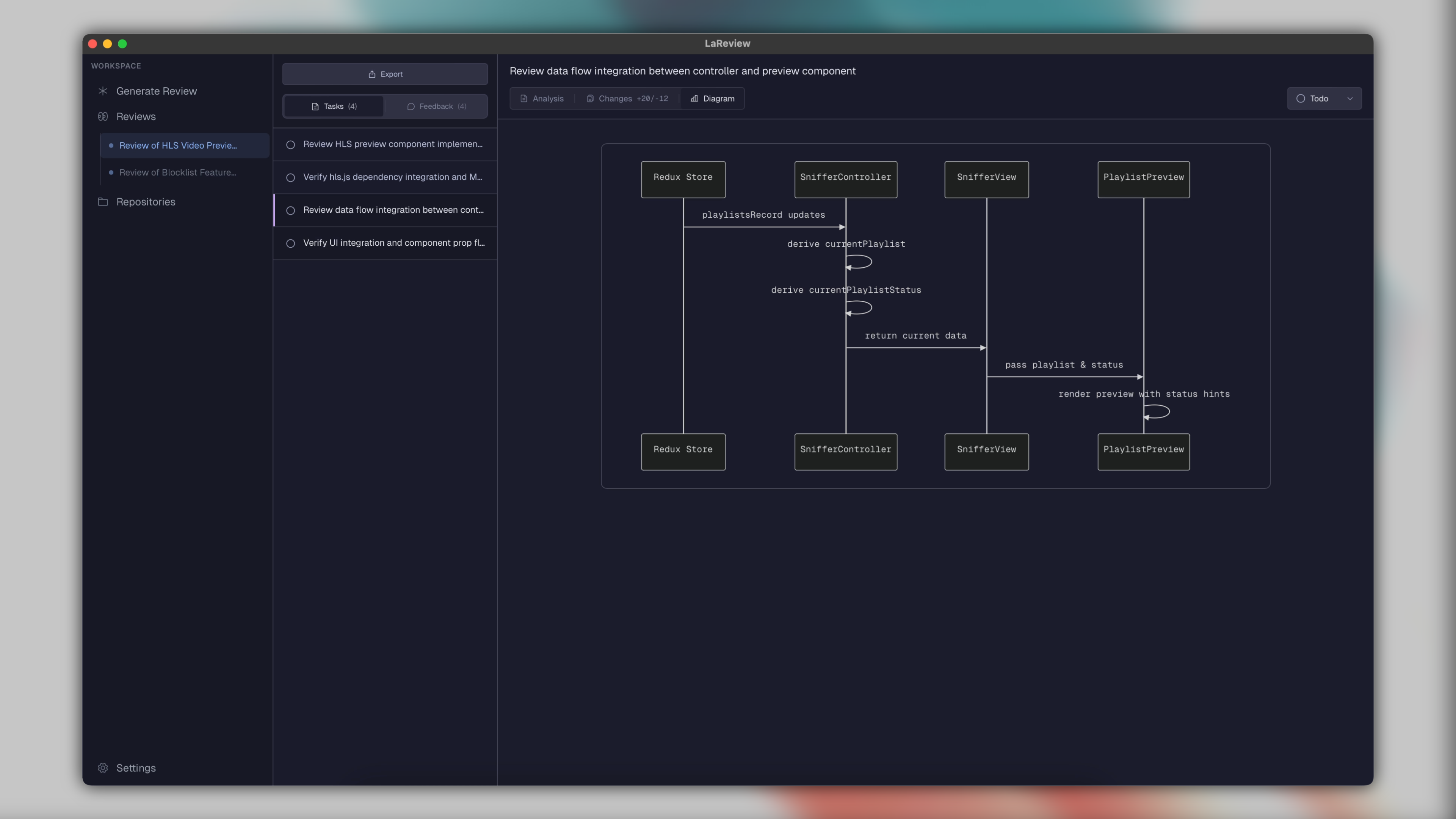 - Visual Diagrams: LaReview автоматически генерирует диаграммы, которые помогают визуализировать архитектурные изменения до того, как разработчик прочтет код.
