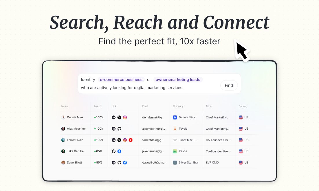 - Умное сопоставление и оценка: Каждый найденный контакт оценивается по релевантности, потенциальному вовлечению и доступности, позволяя пользователям сосредотачиваться на наиболее ценимых контактах.