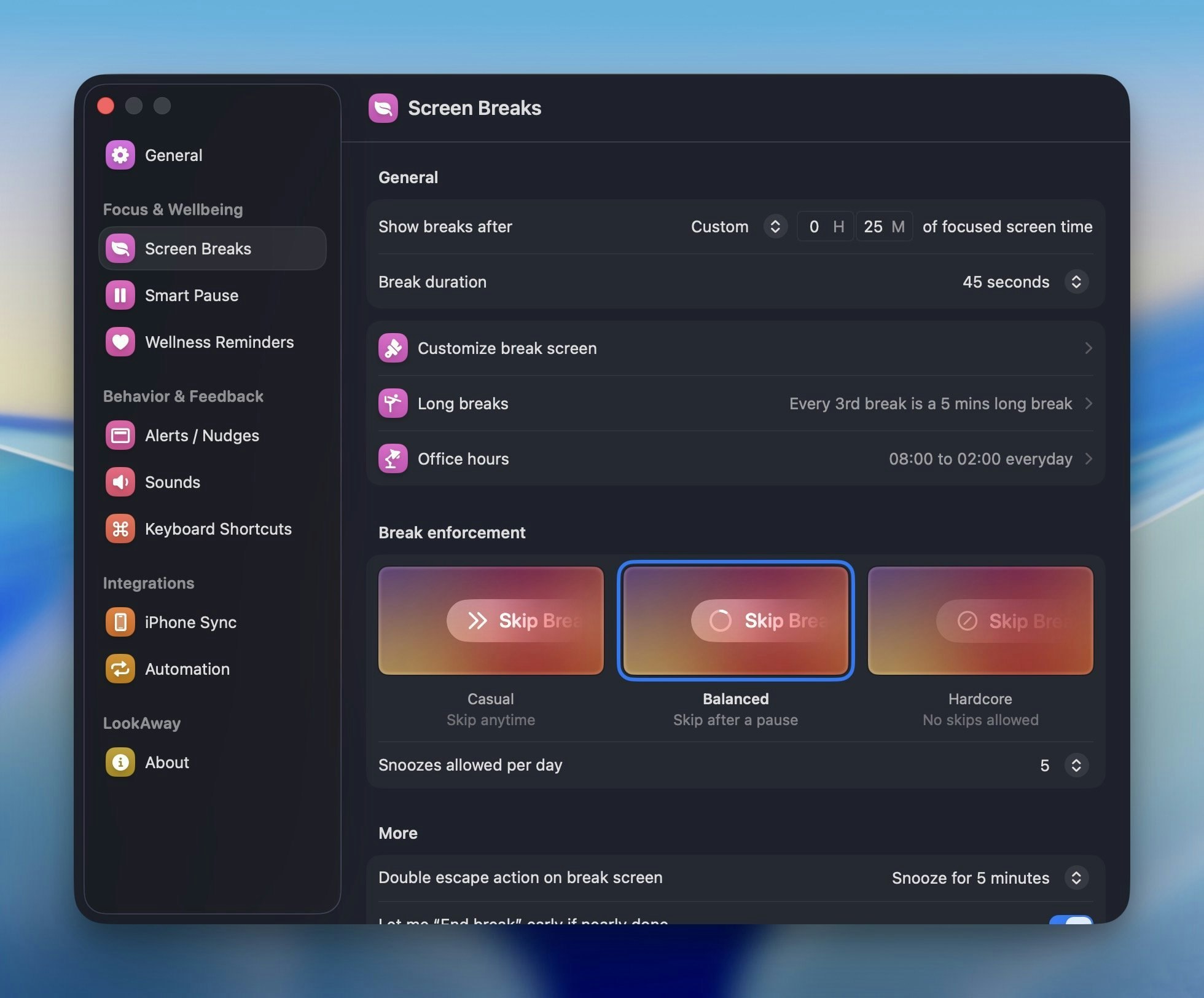 - Умные перерывы: LookAway определяет оптимальные моменты для перерыва, чтобы не прерывать рабочий ритм.
