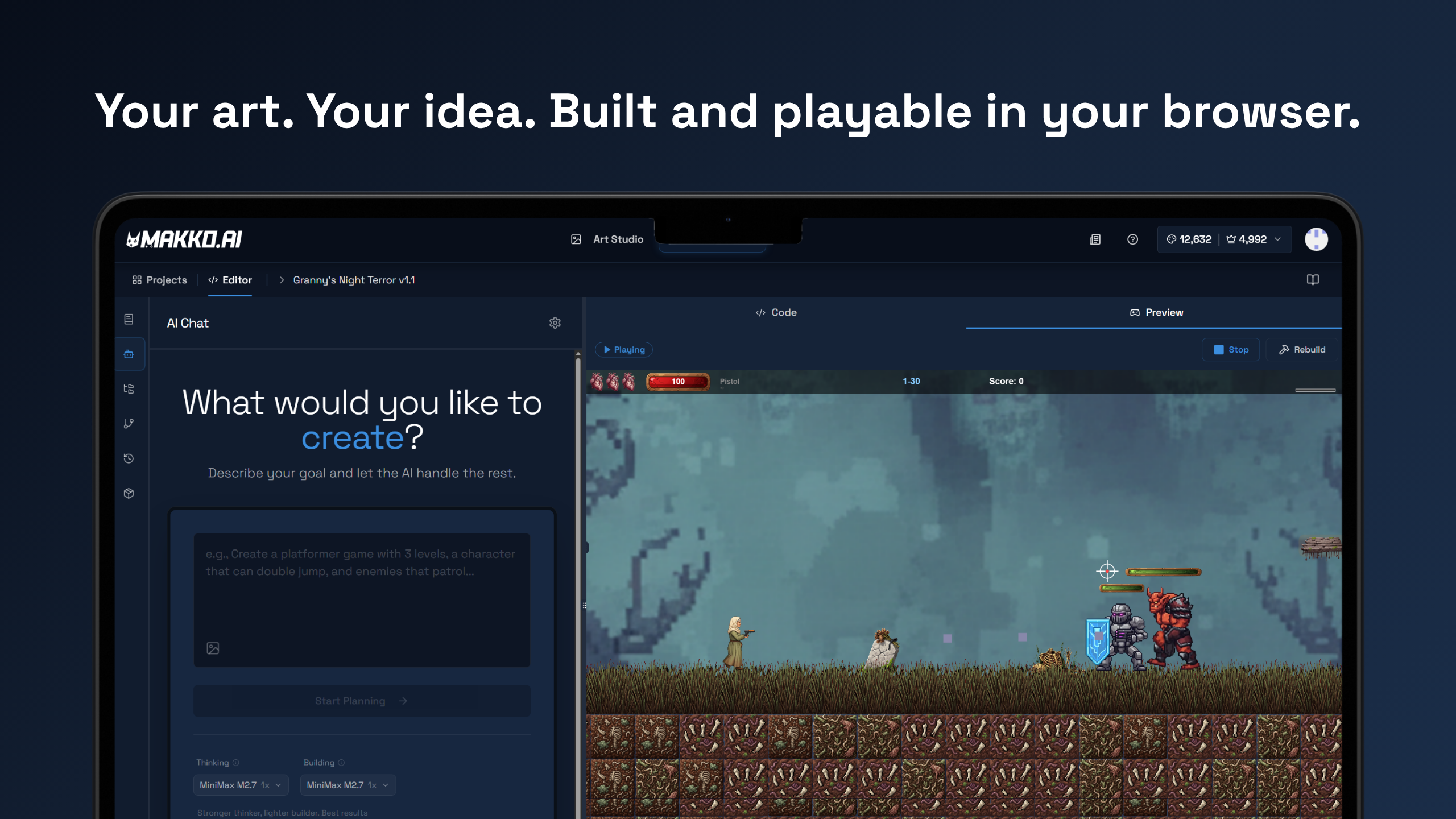 Makko AI — это инновационный инструмент для создания 2D-игр, который позволяет пользователям без специализированных навыков программирования или художественных способностей разрабатывать свои игры и концепт-арты. С помощью искусственного интеллекта Makko обеспечивает создание персонажей, фонов и анимаций на основе текстовых описаний. Это решение призвано упростить процесс разработки игр, предлагая пользователям возможность сосредоточиться на своих идеях, а не на технических аспектах создания игр.