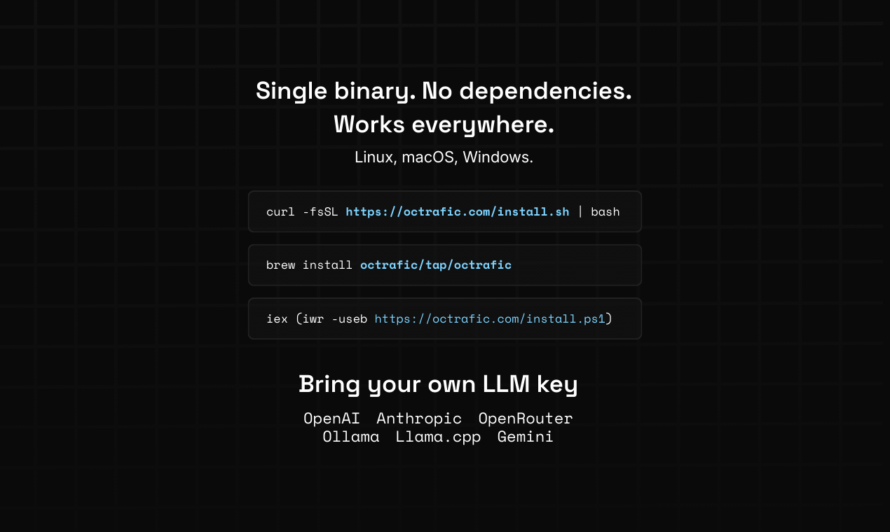 Octrafic — это open-source CLI-инструмент для автоматизации тестирования REST API, который позволяет описывать тестовые сценарии на естественном языке. Инструмент преобразует текстовые запросы в реальные HTTP-запросы, выполняет их и генерирует профессиональные отчеты в формате PDF.