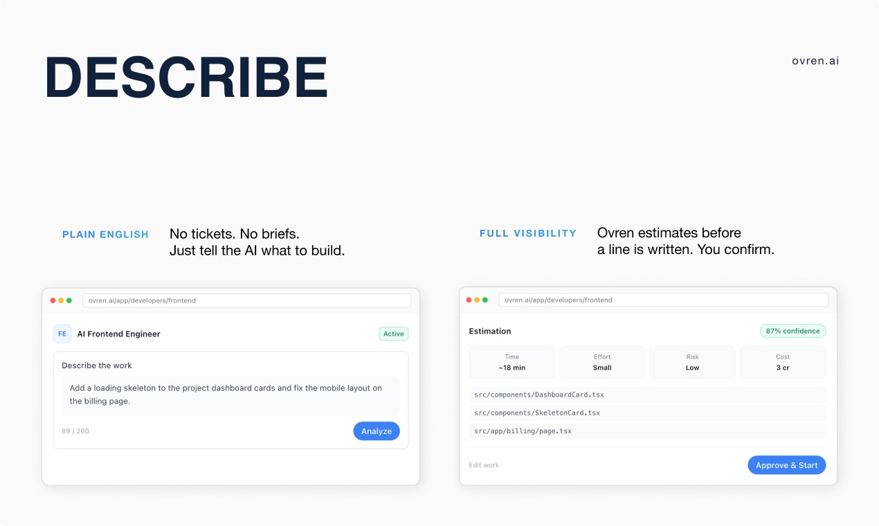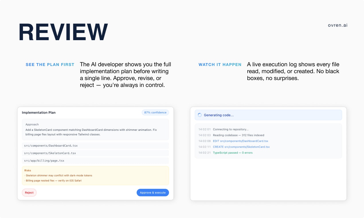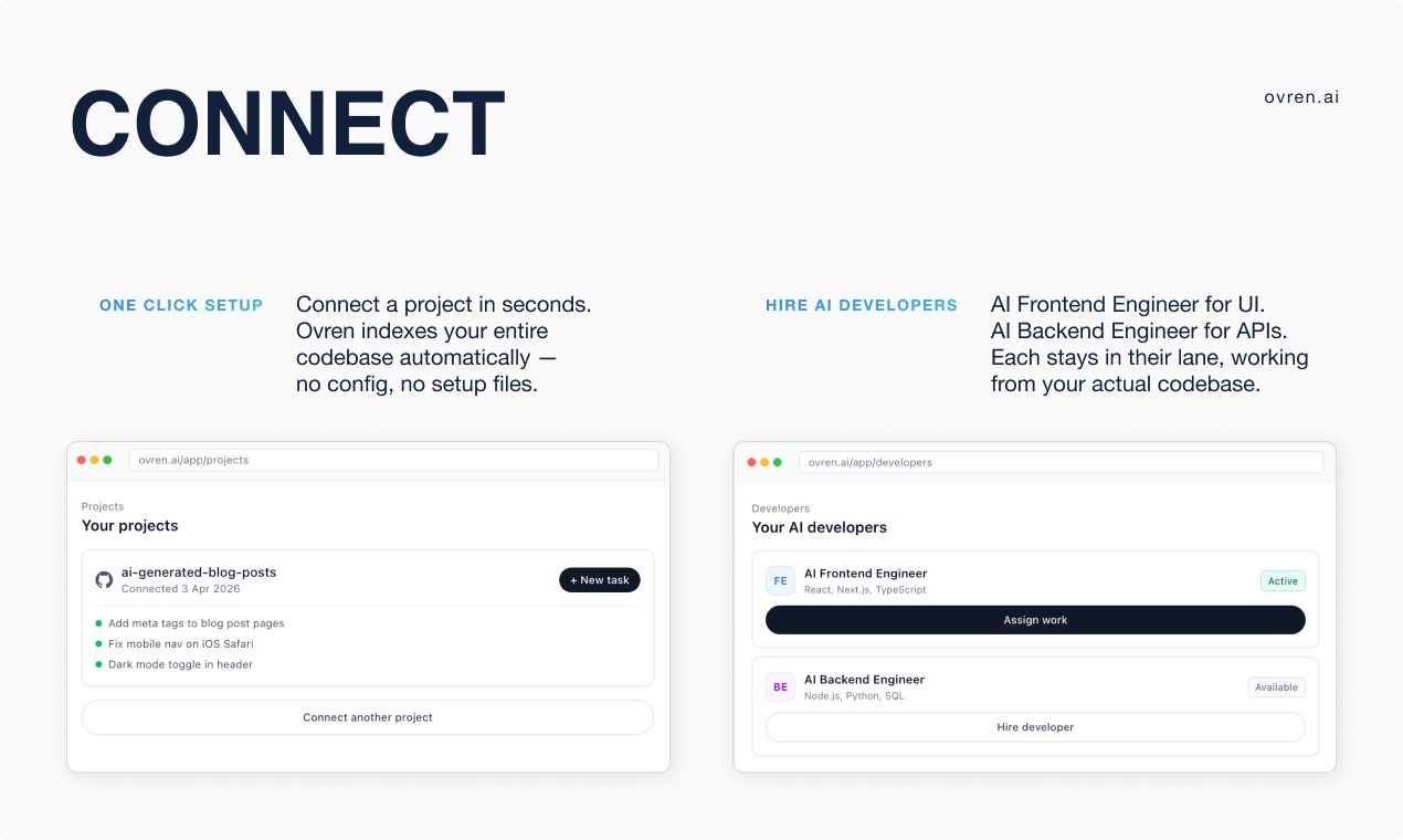 Основная проблема, которую решает Ovren, заключается в высоком времени и трудозатратах на ручное выделение задач и их выполнение. Используя этот сервис, разработчики могут значительно снизить объем рутинной работы, позволяя AI-инженерам автоматически извлекать задачи из бэклога и выполнять их, что делает процесс более эффективным и управляемым.