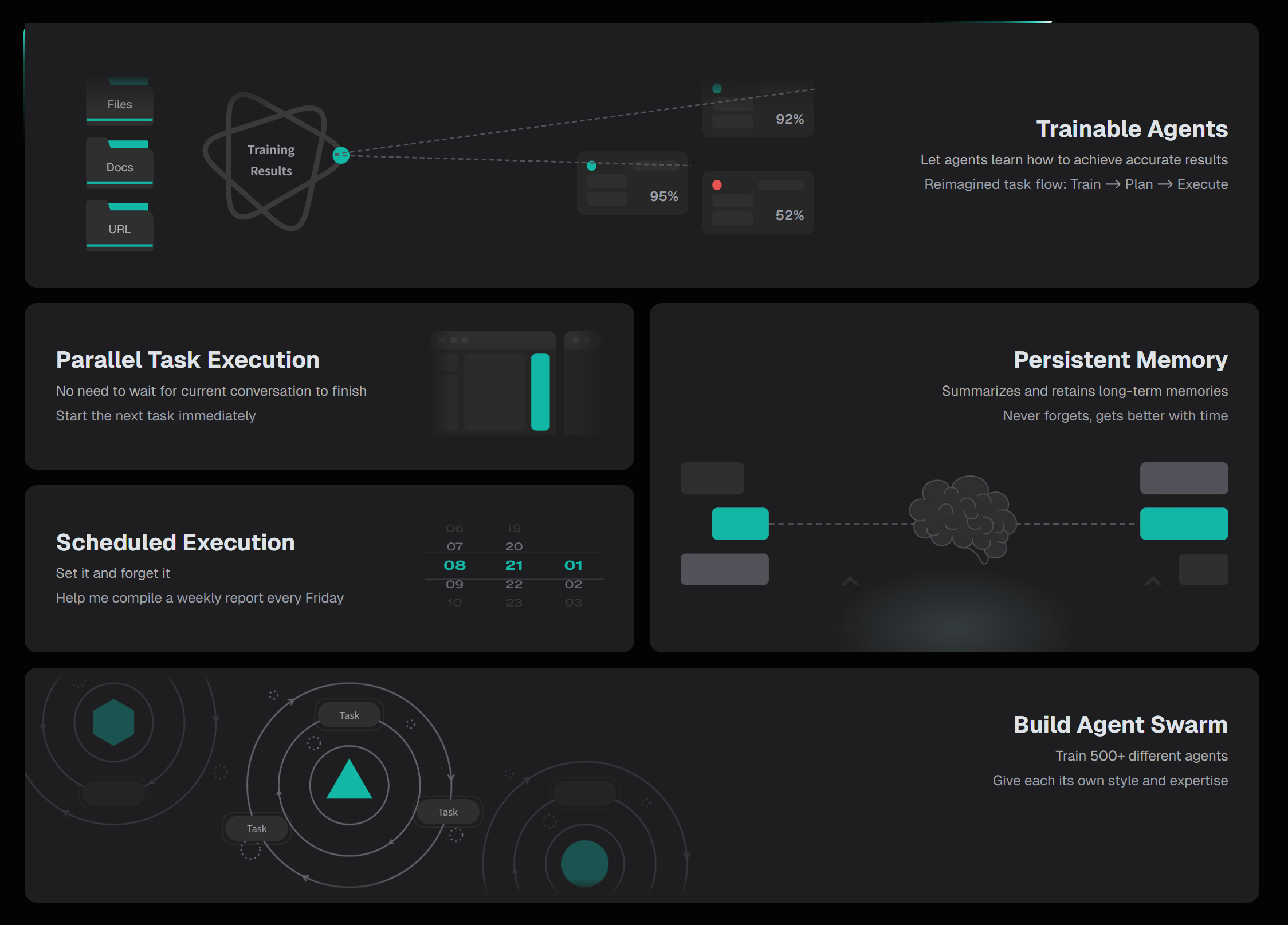 - ✓ Простота в обучении и использовании без необходимости программирования /n Уникальная возможность создания specialized agents с узкими навыками /n Автоматизация процессов в реальном времени с помощью расписаний