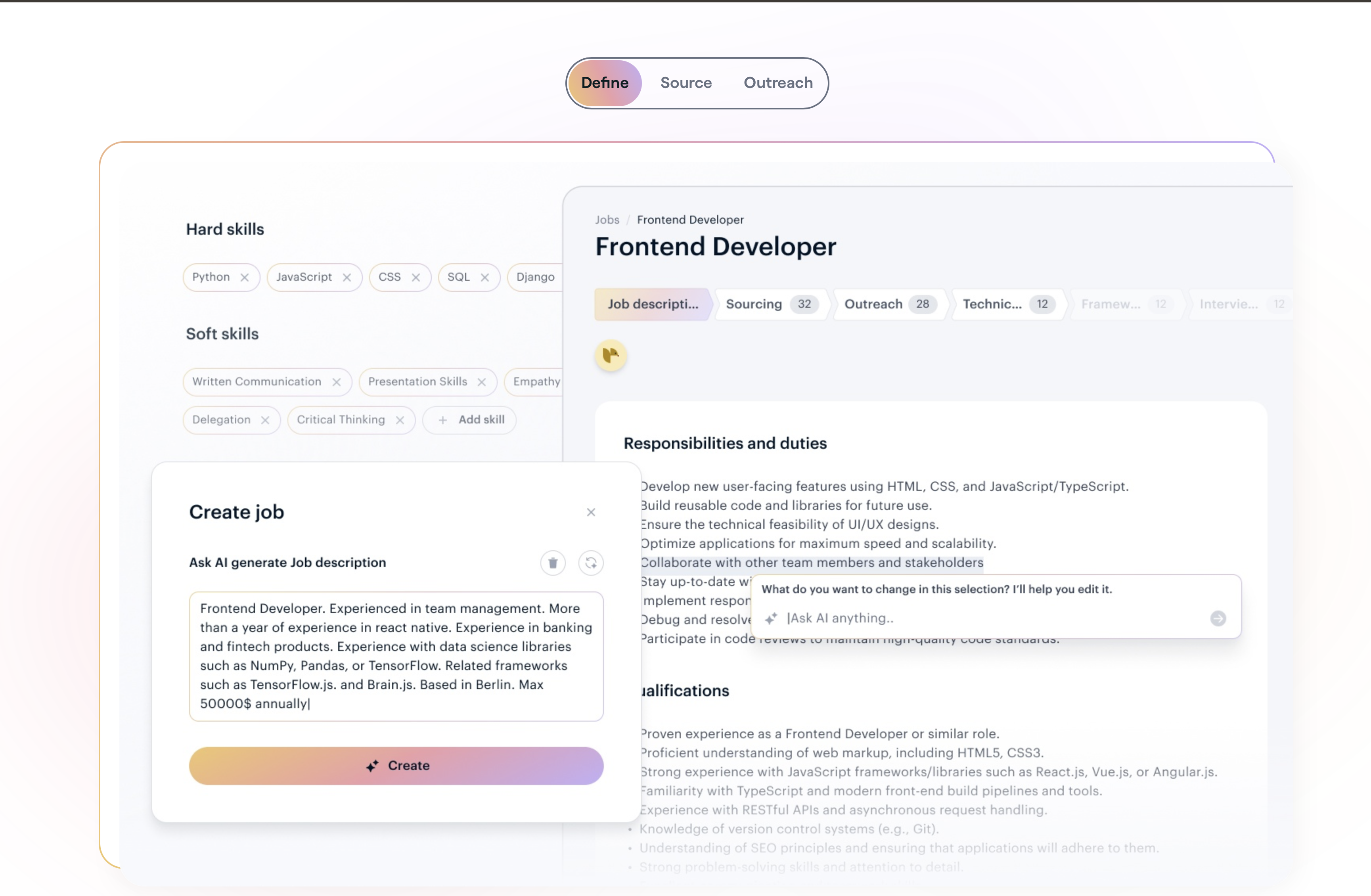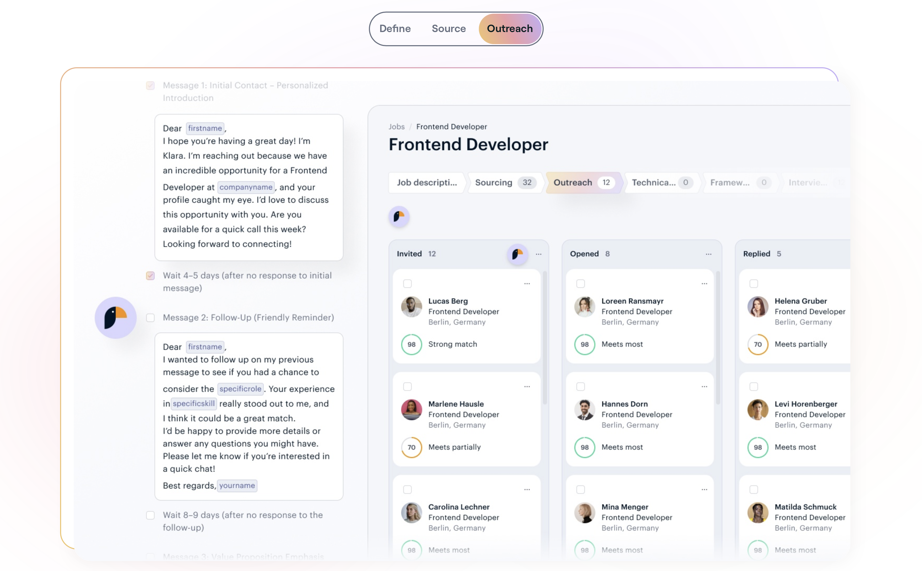 - Кампании по Outreach: Генерация и управление кампаниями по привлечению кандидатов с помощью автоматизации, сокращая время на Kommunikation.