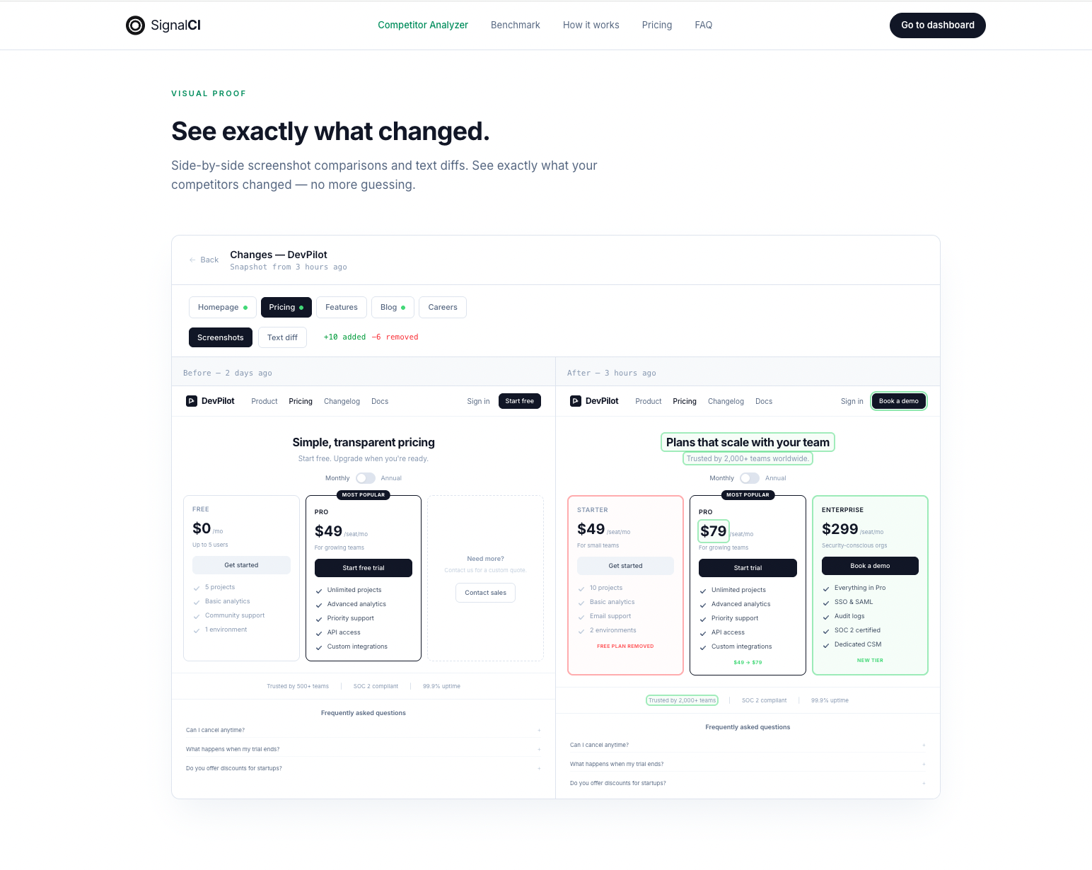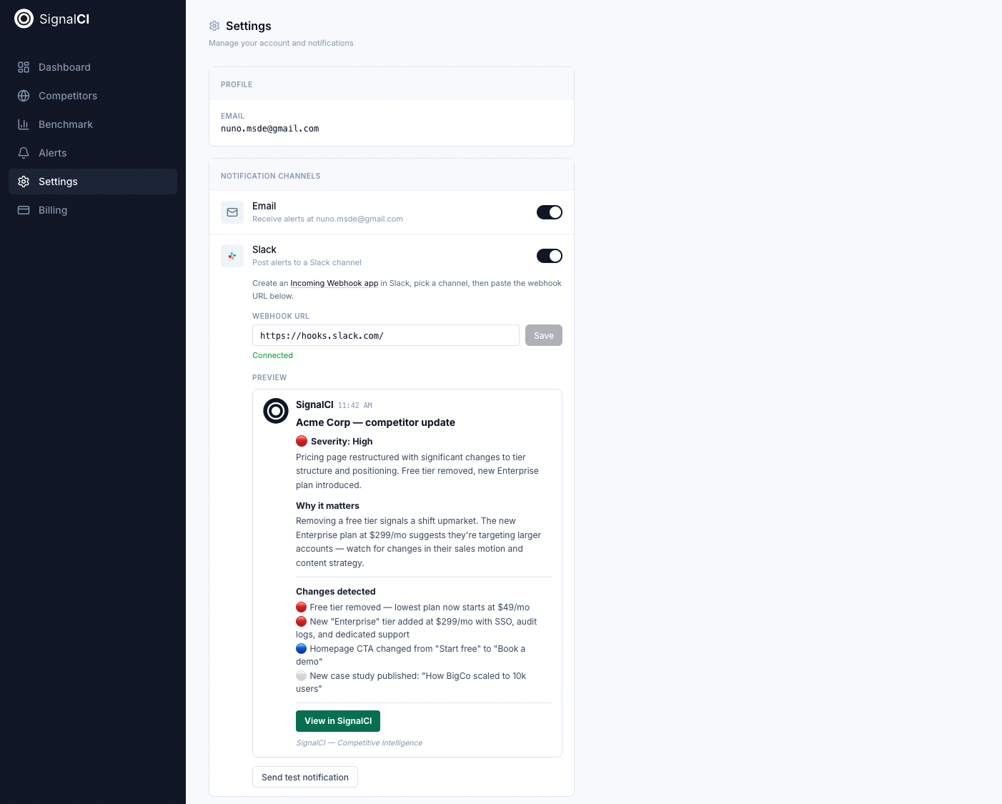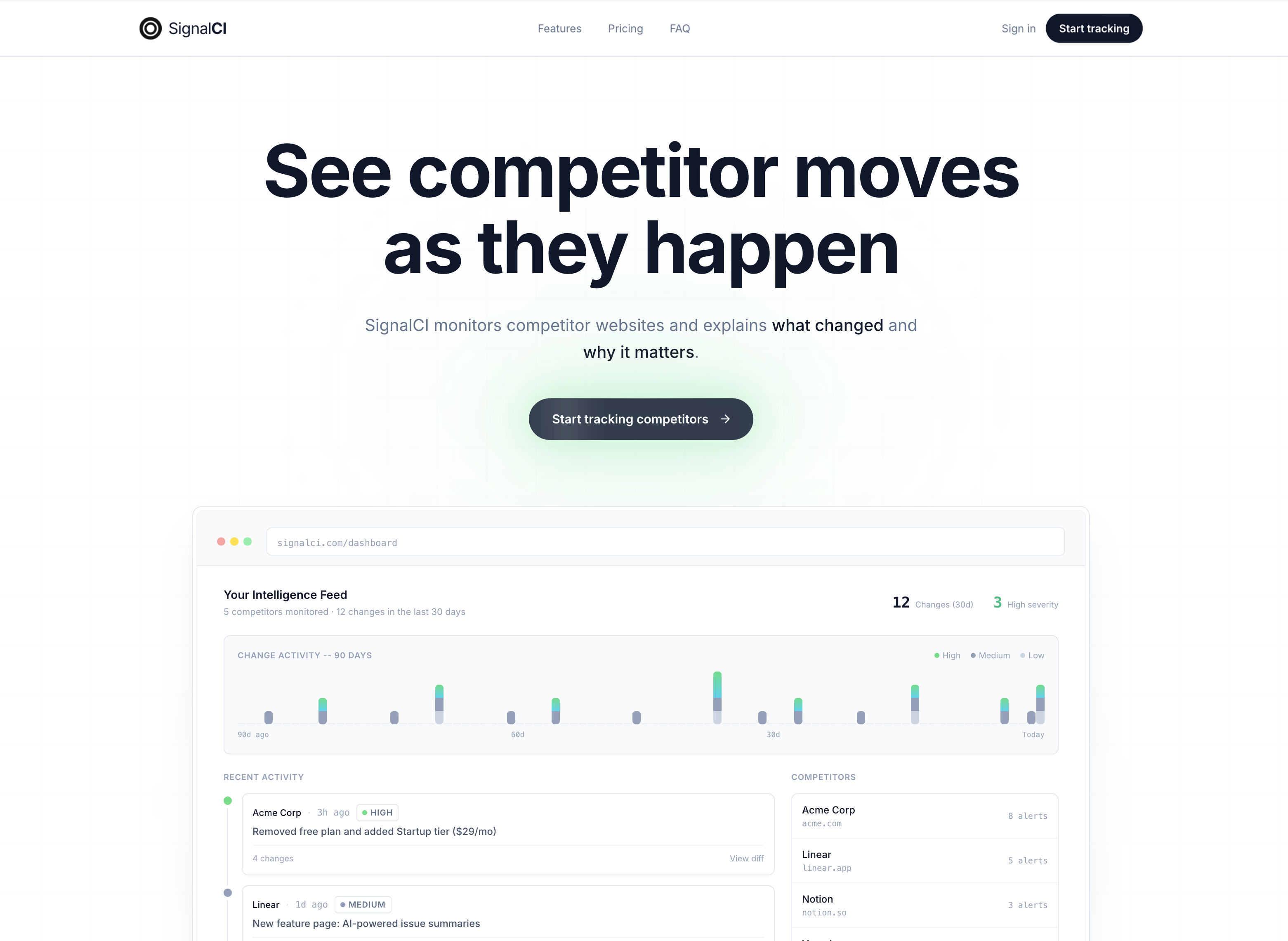 SignalCI — это инструмент автоматизированного конкурентного анализа для SaaS-компаний. Сервис мониторит веб-сайты конкурентов, обнаруживает изменения на ключевых страницах (цены, функции, месседжинг, блог, карьеры) и с помощью ИИ объясняет, что изменилось и почему это важно для вашей стратегии.