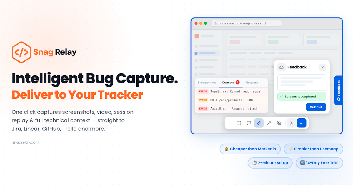 SnagRelay — это инструмент для сбора пользовательских отзывов и отчетов об ошибках, который помогает командам разработчиков быстро и эффективно фиксировать технические проблемы и недостатки на веб-приложениях. С его помощью пользователи могут одним кликом отсылать отчеты, которые включают скриншоты, рекорды сессий и техническую информацию непосредственно в существующие системы управления задачами, такие как Jira, Linear, GitHub или Trello. Инструмент значительно ускоряет процесс обработки отзывов, избавляя от необходимости вспоминать детали ошибки и минимизируя время, требуемое для ее диагностики и исправления.