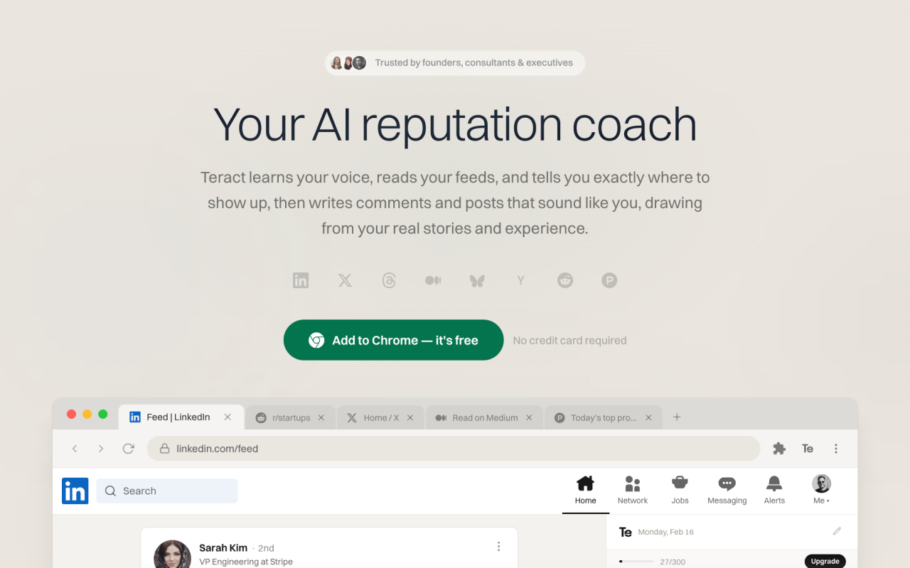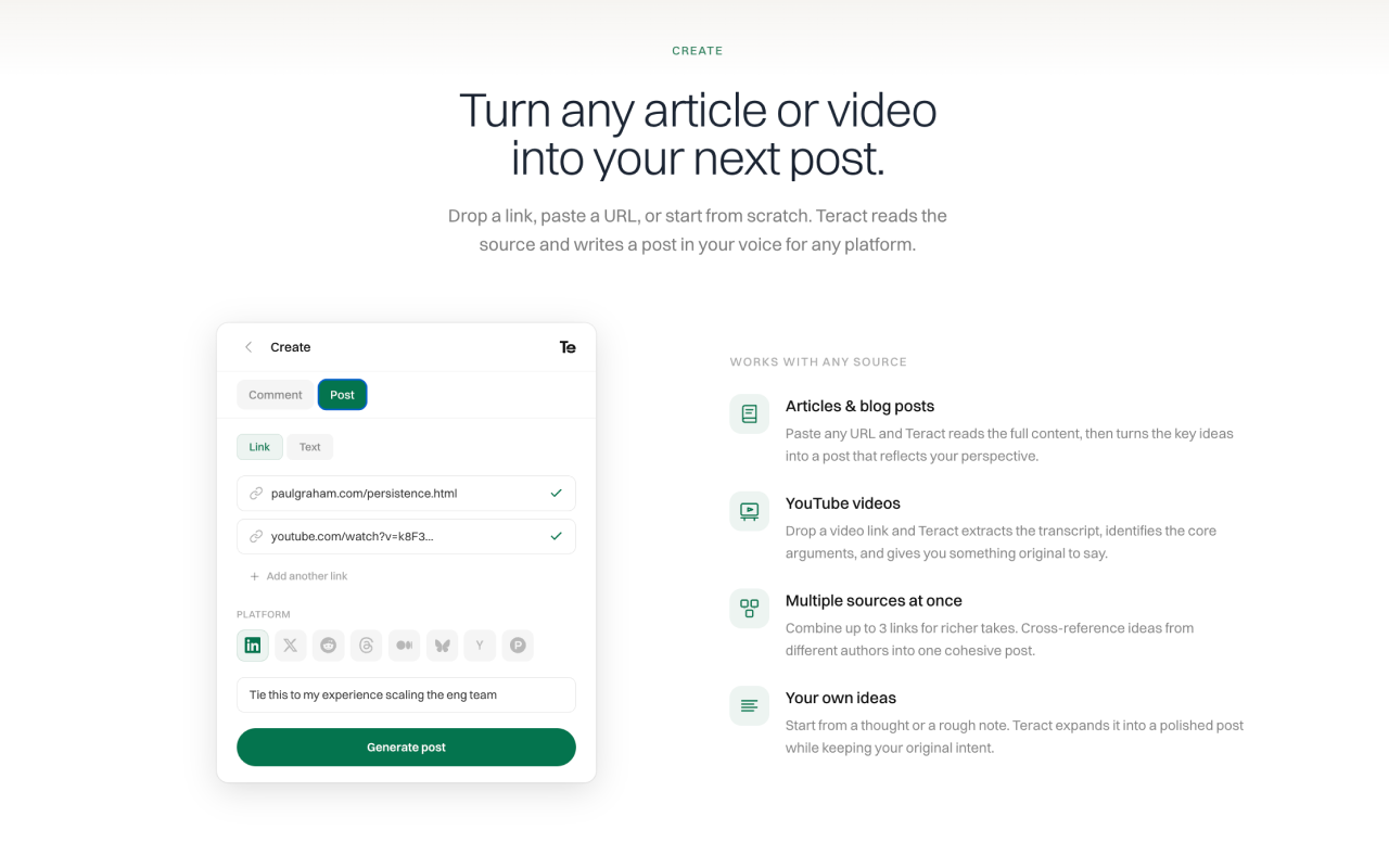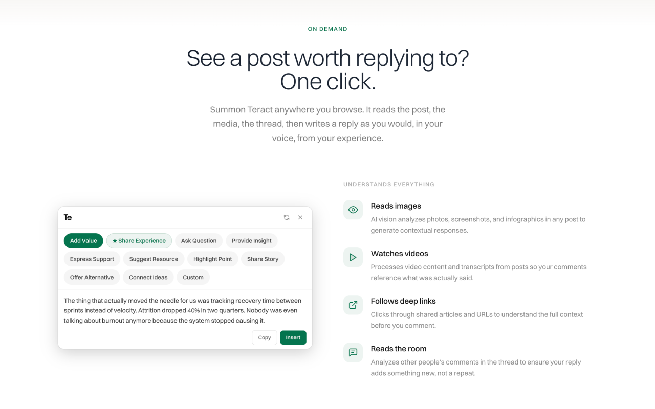 Сервис Teract позиционируется как инструмент для профессионалов, который помогает создавать контент, отражающий ваш уникальный стиль и экспертизу. Основная идея — не генерировать шаблонные тексты, а анализировать вашу историю публикаций, карьерный опыт и личные истории, чтобы писать комментарии и посты, которые звучат как ваш голос.