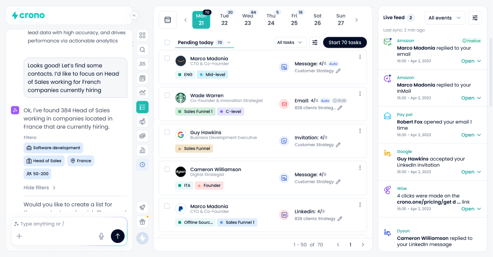- Оценка и фильтрация лидов: Crono анализирует данные и сигнализирует о наиболее перспективных клиентах, что помогает определять приоритеты для работы.
