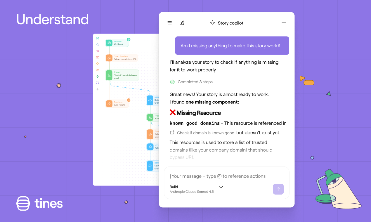 Story Copilot — это инновационный AI-инструмент от компании Tines, предоставляющий пользователям возможность управлять, поддерживать и создавать истории (агенты, автоматизации, плейбуки и т.д.) с помощью естественного языка. Этот инструмент помогает пользователям легче ориентироваться в сложных тасках, предоставляя им интуитивный интерфейс, который позволяет задавать команды и получать ответы на основе контекста заданий.