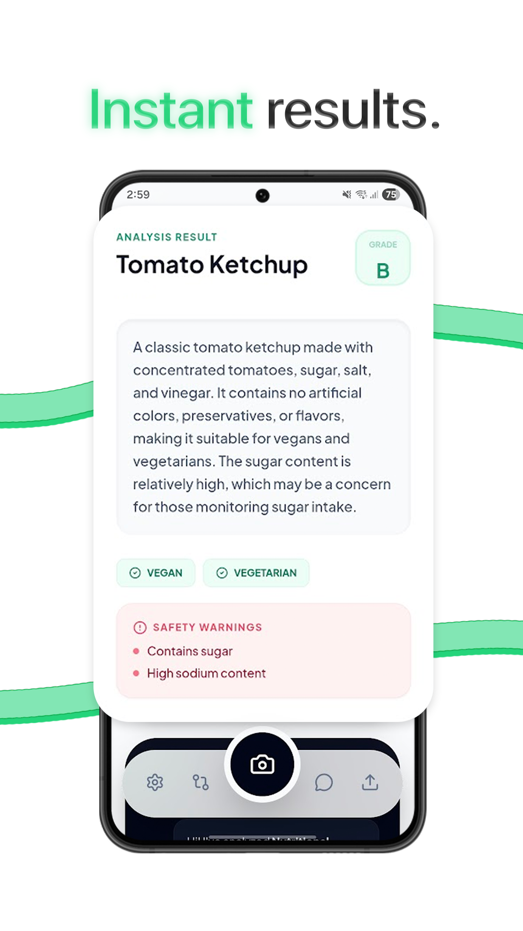 - Рекомендации по замене: Предлагает альтернативы на более здоровую пищу, если выбранный продукт содержит нежелательные ингредиенты.
