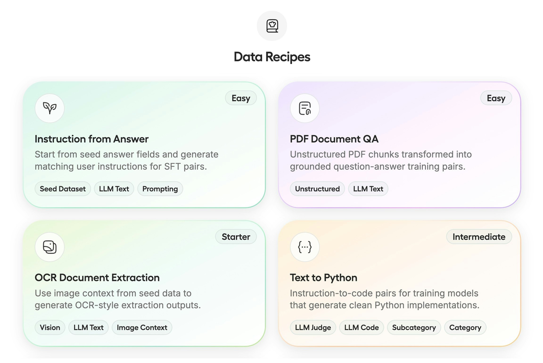 - Data Recipes: Трансформация неструктурированных данных из документов в готовые датасеты с помощью графовых рабочих процессов.