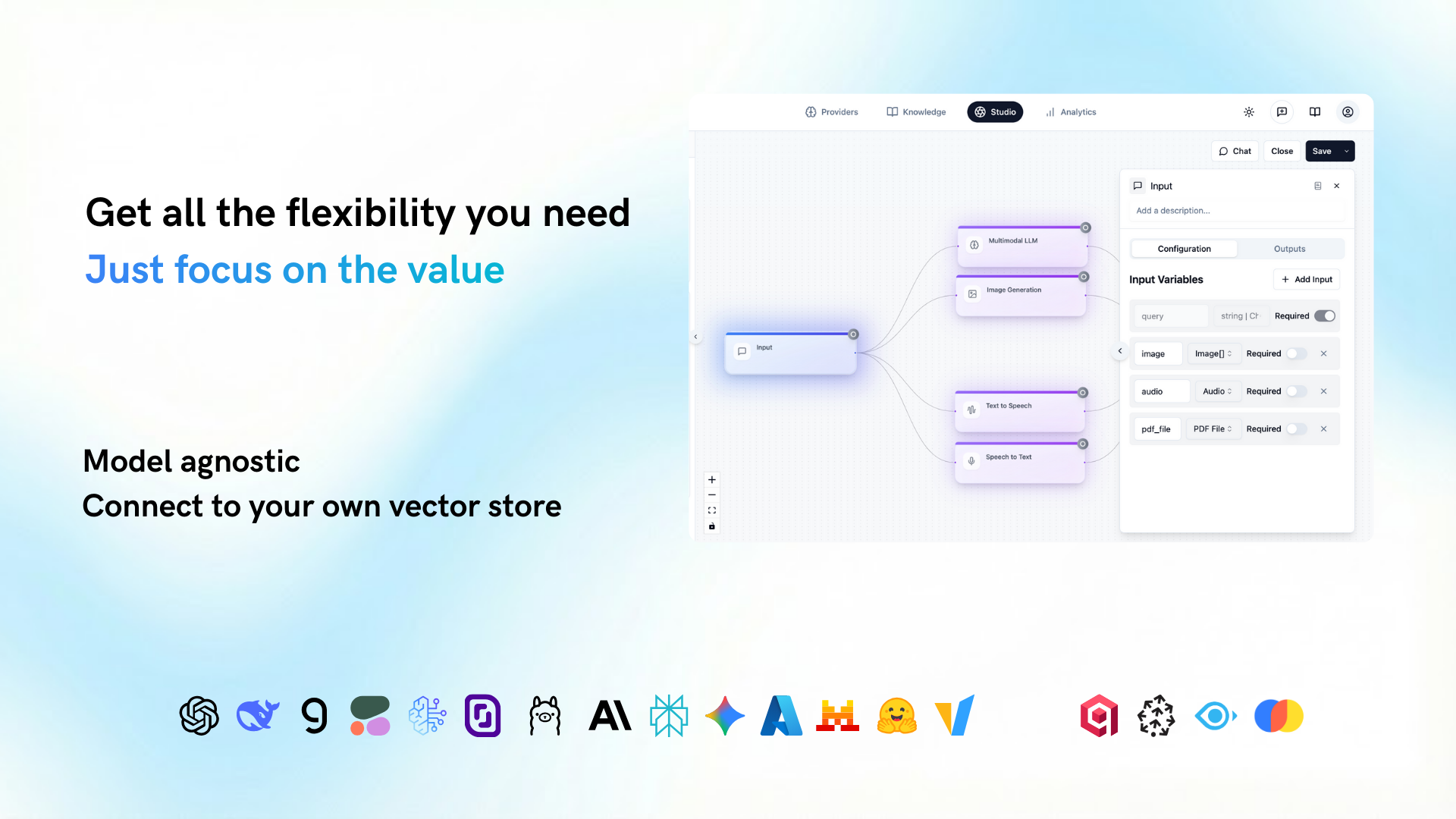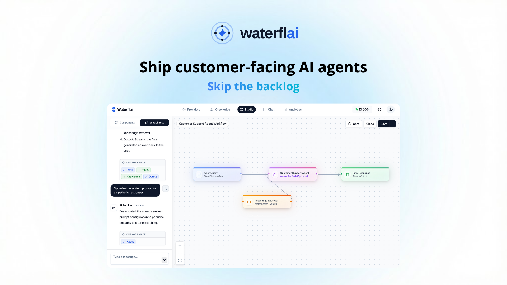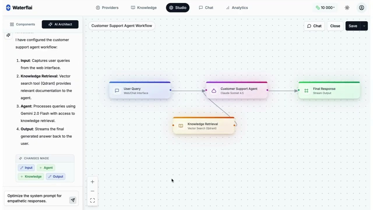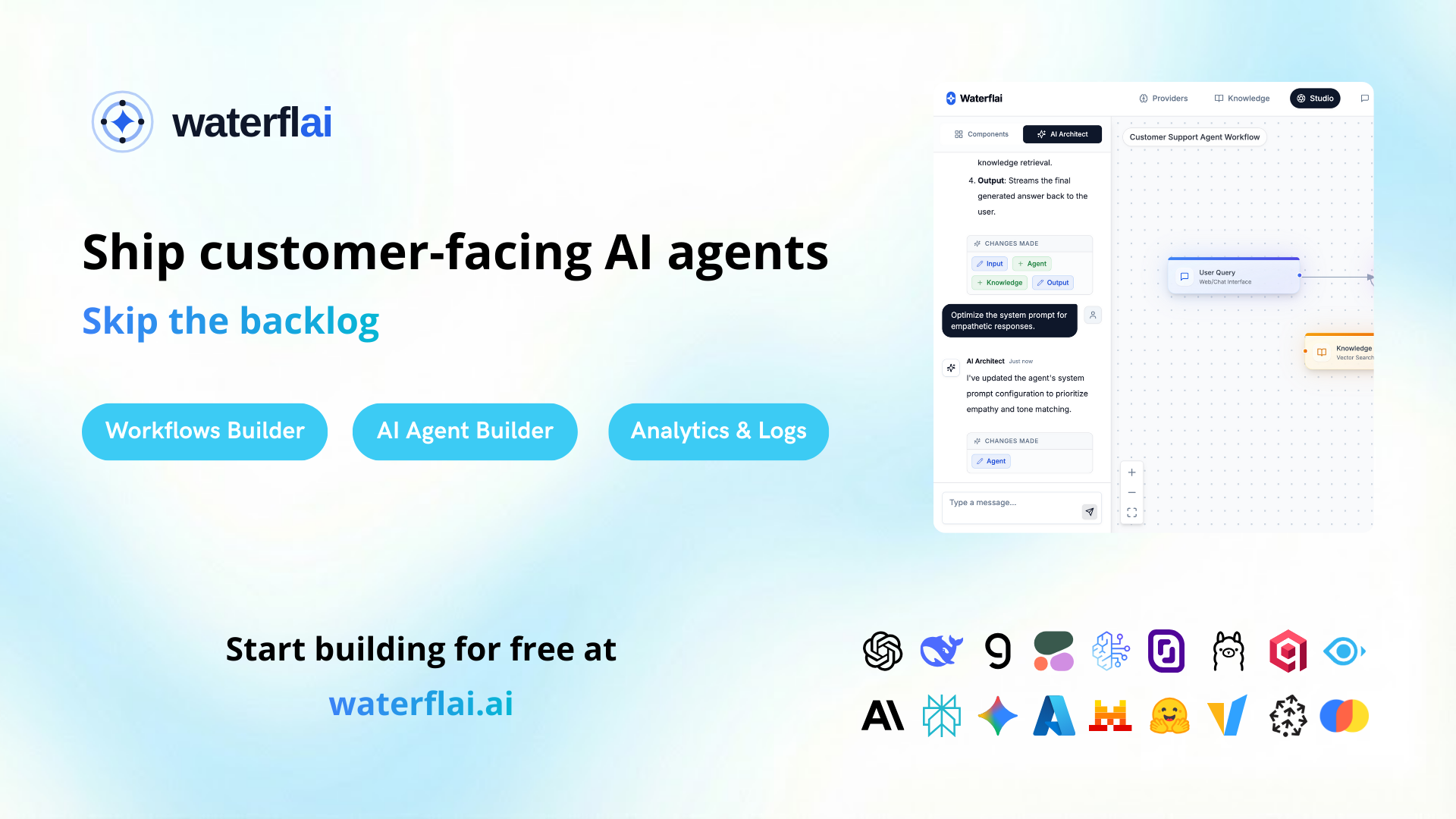 - Zero Vendor Lock-in: Waterflai минимизирует зависимость от конкретных поставщиков AI, позволяя быстро переключаться между разными моделями по мере необходимости.