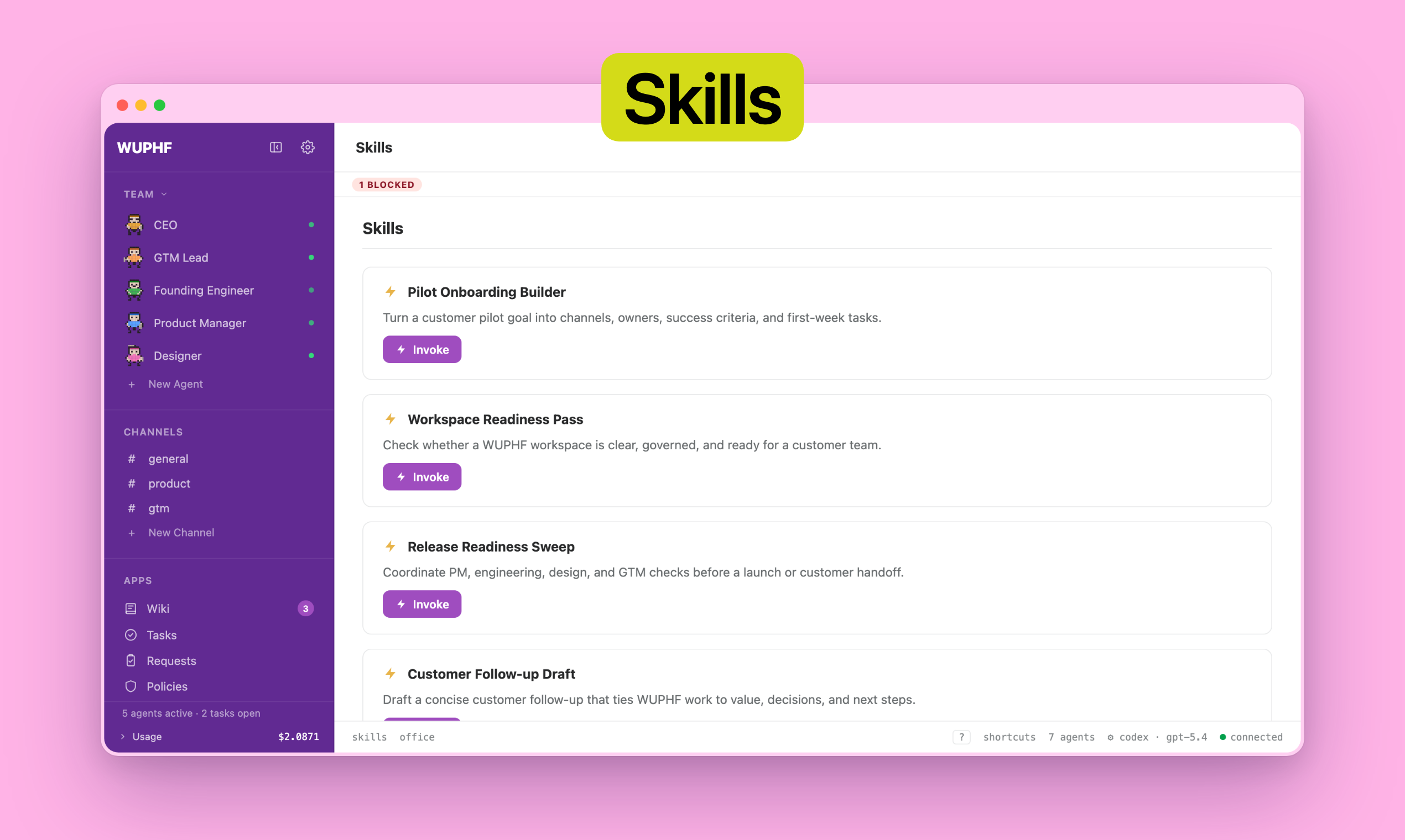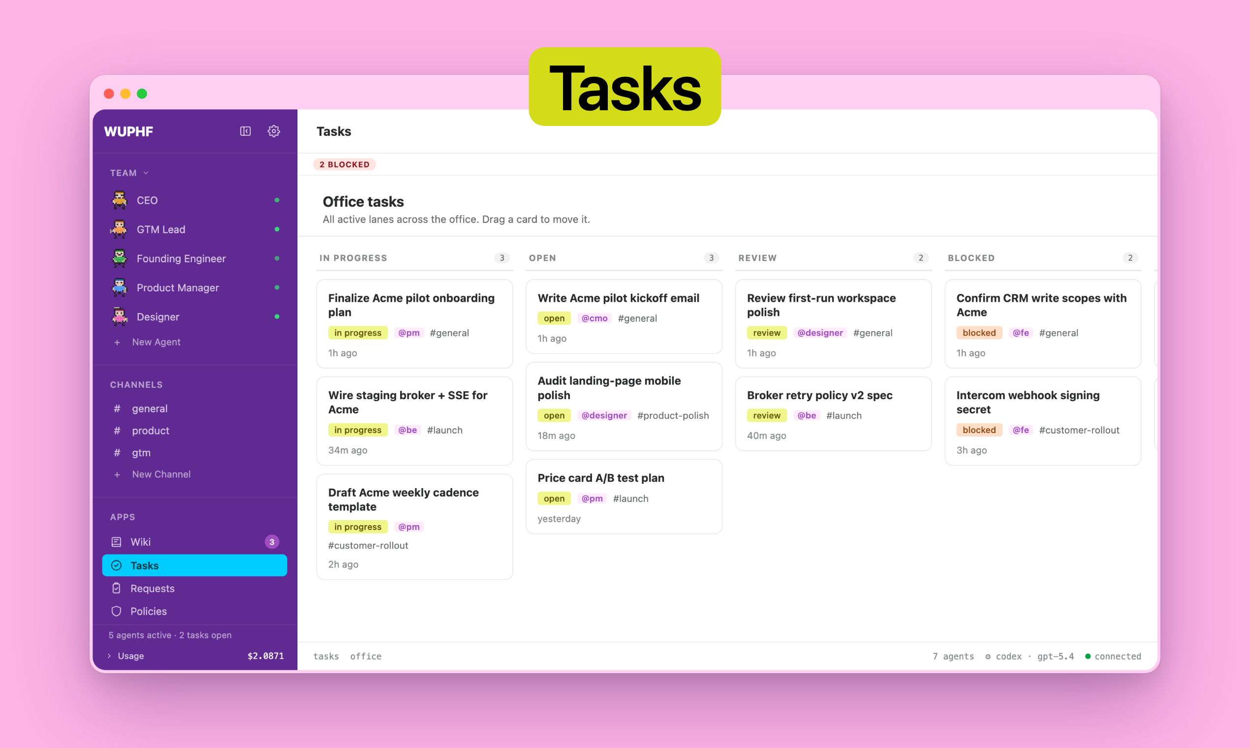 WUPHF — это уникальный инструмент, который создает локальный офис AI-сотрудников, работающих на вашей машине. Оның қызметі – автоматизировать управление задачами и упрощать рабочие процессы, позволяя пользователям задавать цели и наблюдать за выполнением задач без постоянного вмешательства. С помощью WUPHF пользователи могут оставлять цели, а AI-сотрудники будут работать над их выполнением, координатор обеспечивает распределение задач и взаимодействие между агентами для достижения поставленной цели.